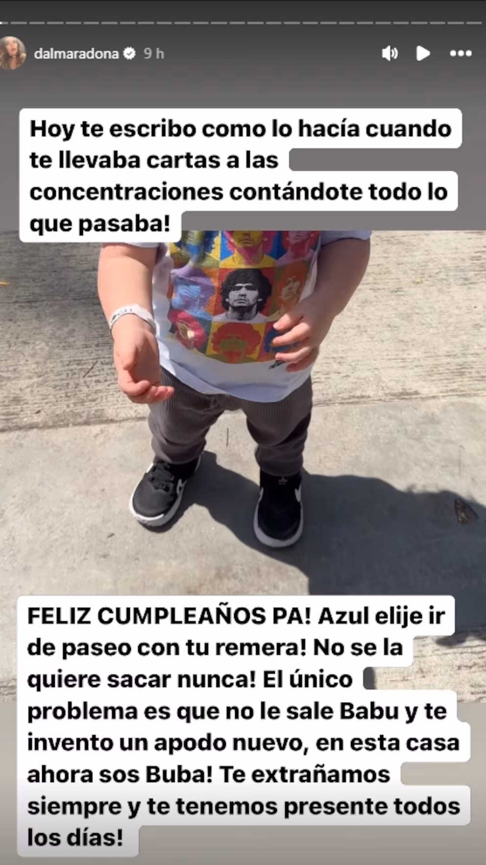 Dalma, la mayor de las hijas del Diez, fue la primera en recordar a su padre en Instagram. Con una carta que parece sacada de su juventud, evocó aquellas épocas en las que le escribía para contarle “todo lo que pasaba” mientras él se encontraba en las concentraciones de sus equipos. “Hoy te escribo como lo hacía cuando te llevaba cartas a las concentraciones contándote todo lo que pasaba”, escribió en un mensaje que revela cuánto lo sigue teniendo presente. También compartió cómo su hija, la pequeña Azul, muestra el amor por un abuelo que nunca conoció, pero que forma parte de su día a día. La niña se niega a sacarse una camiseta de Diego e incluso inventó para él un nuevo apodo, llamándolo “Buba”. “El único problema es que no le sale ‘Babu’ y te inventó un apodo nuevo, en esta casa ahora sos Buba”, comentó la joven, sumergiendo a sus seguidores en una imagen entrañable, una forma más en que la memoria del ídolo permanece viva en las generaciones futuras.