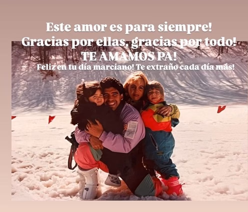 Por su parte, Giannina Maradona también se sumó al homenaje, al compartir una imagen antigua de una escena familiar en la nieve. En la fotografía se la ve junto a su padre, su madre y su hermana Dalma, en un momento íntimo de aquellos que solían compartir en familia. “Este amor es para siempre. Gracias por ellas, gracias por todo. ¡Te amamos, Pa!”, escribió, al expresar lo que para ella representa ese recuerdo congelado en el tiempo. Sin contener la emoción, agregó: “Feliz en tu día, marciano. Te extraño cada día más”. Con el apelativo “marciano”, un término que usaba en la intimidad para referirse a su padre, hizo patente cómo lo percibe aún hoy como alguien extraordinario, casi de otro mundo, un ser único que dejó un vacío imposible de llenar.