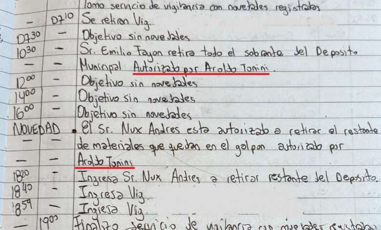 Más tarde, a las 16:00 hs. de ese mismo día, se registra: “El sr. Nux Andrés está autorizado a retirar el restante de materiales que quedan en el galpón autorizado por Aroldo Tonini”. El retiro de los elementos se concretó dos horas y veinte minutos más tarde (18:20 hs).