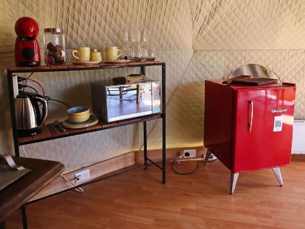 La oferta existe hace un año, pero investigar cómo construirlos “fue complicado”, relata Fernanda. Los tres domos son ecológicos, su construcción es en seco y están hechos por su compañero. Cuentan con una plataforma de madera con techo de hierro, aislantes en piso y carpa que deja ver el paisaje tafinisto.