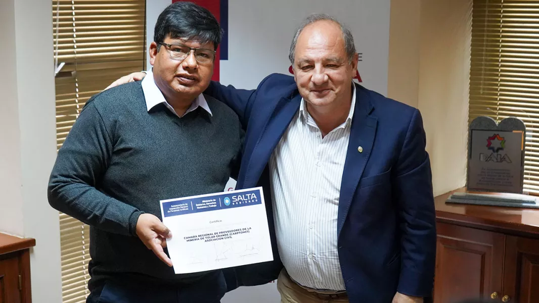 La Cámara Regional de Proveedores de la Minería de Tolar Grande recibió su personería jurídica en un acto encabezado por el ministro de Gobierno, Derechos Humanos y Trabajo, Ricardo Villada. El reconocimiento legal certifica la existencia de la organización y la actividad social que desarrolla en la comunidad.