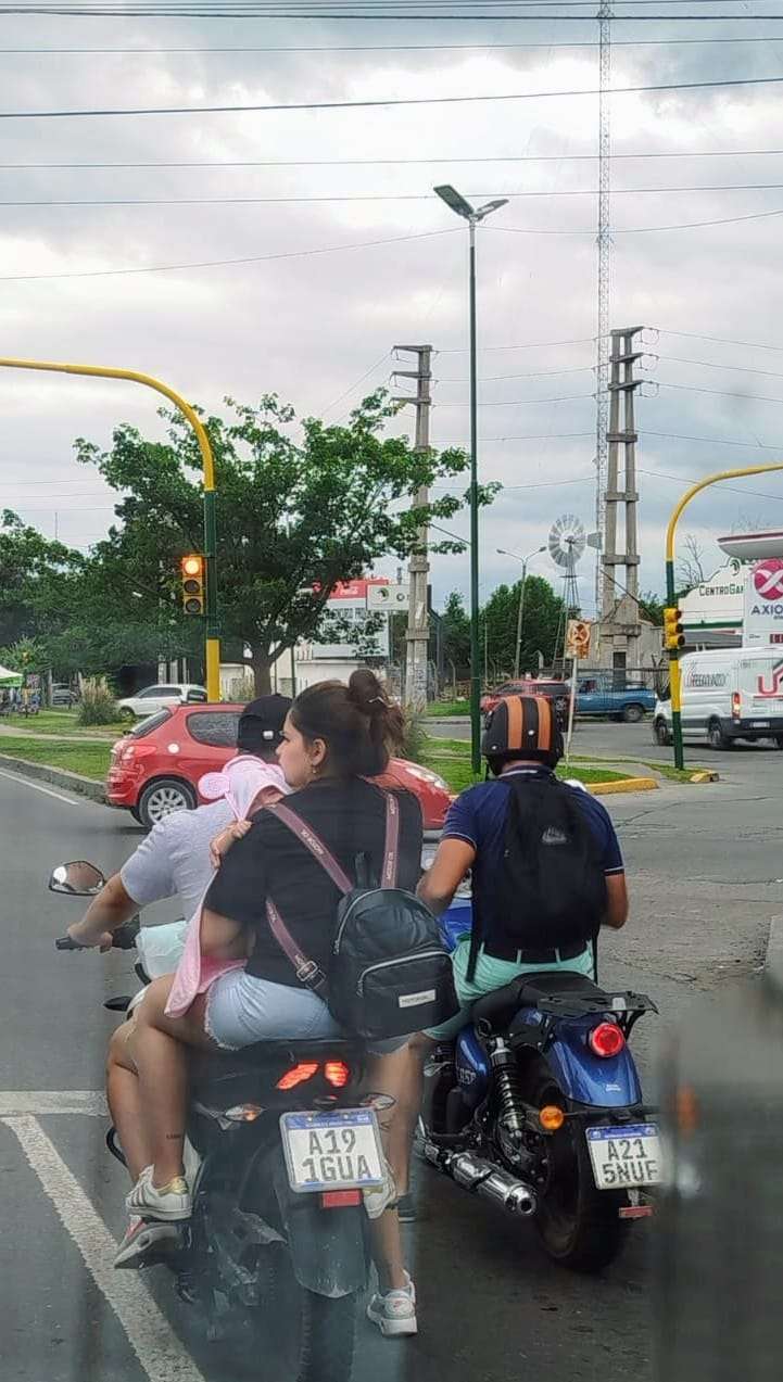 - Tres adultos circulando en una moto sin cascos de seguridad.