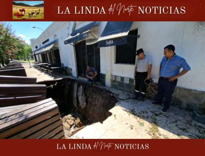 Luego del fuerte temporal registrado ayer por la tarde, la vereda del pasaje Miramar, donde funciona un reconocido local gastronómico, sufrió daños severos que derivaron en el hundimiento de parte de la calzada peatonal.