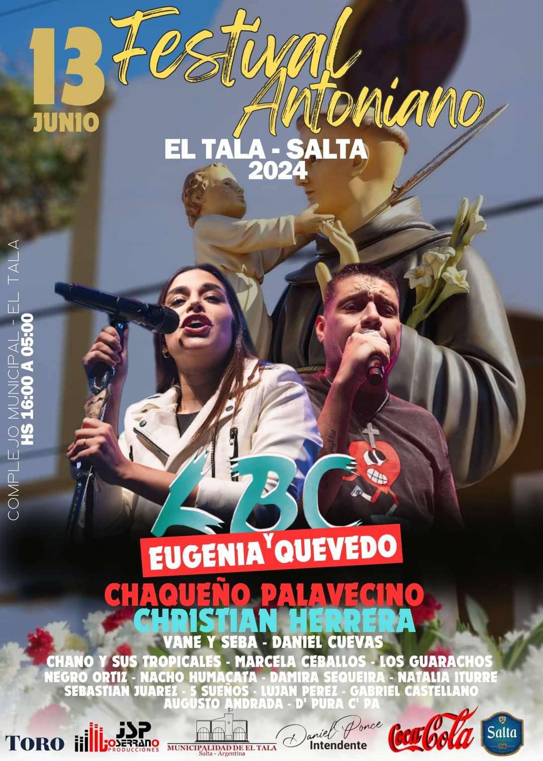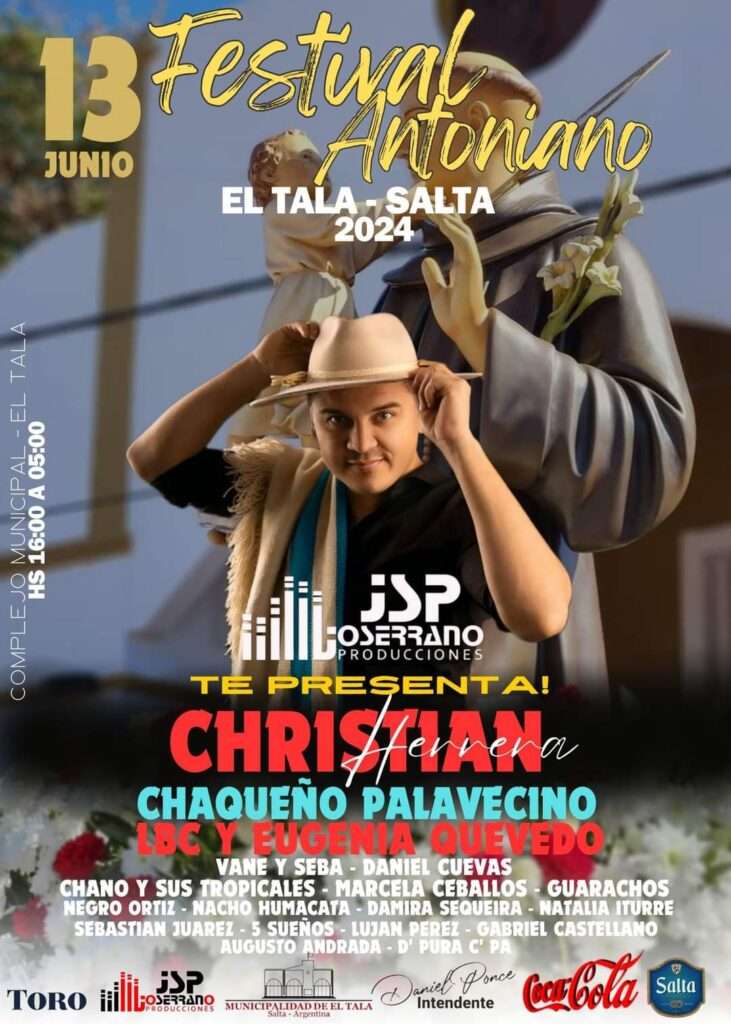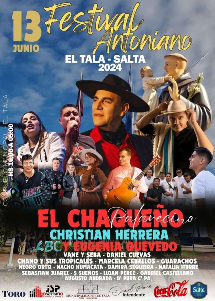 Este año, el Festival Antoniano se llevará a cabo en el Complejo Deportivo El Tala con la presencia de grandes artistas como El Chaqueño Palavecino, Cristian Herrera, LBC y Eugenia Quevedo y muchos más.