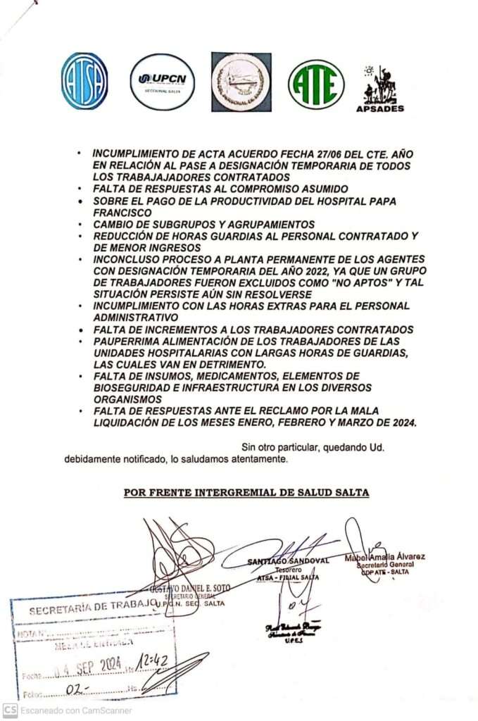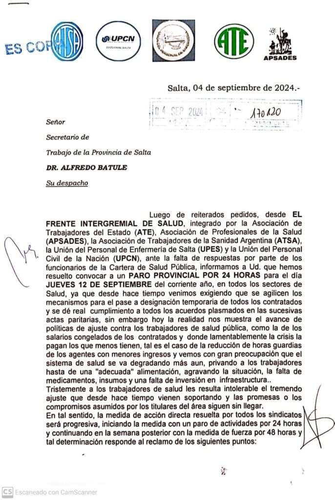 El Frente Intergremial de Salud, compuesto por la Asociación de Trabajadores del Estado (ATE), Asociación de Profesionales de la Salud (APSADES), Asociación de Trabajadores de la Sanidad Argentina (ATSA), Unión del Personal de Enfermería de Salta (UPES) y Unión del Personal Civil de la Nación (UPCN), anunció un paro provincial de 24 horas para el jueves 12 de septiembre en todos los sectores de salud de la provincia.