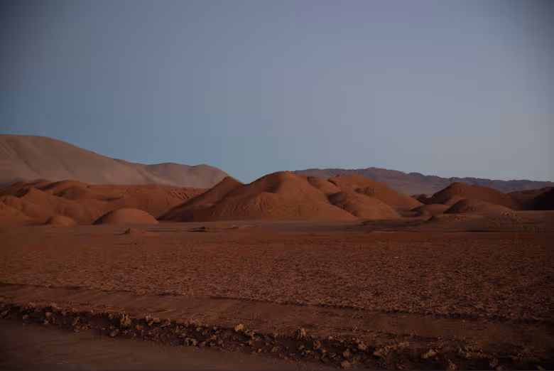La tarde va cayendo y de regreso al pueblo, con la luna casi posada sobre el filo de los cerros, los colores rojizos toman intensidad y, otra vez, aparece el “paisaje marciano” como referencia, a fuerza de caer en la repetición.