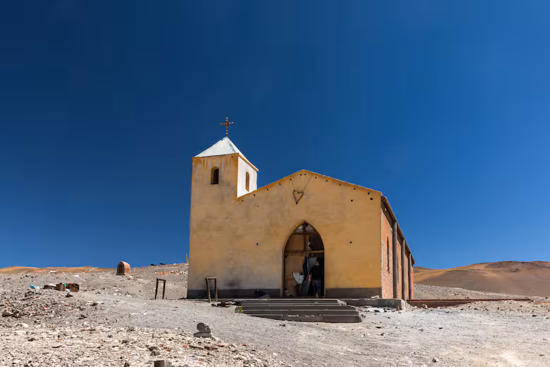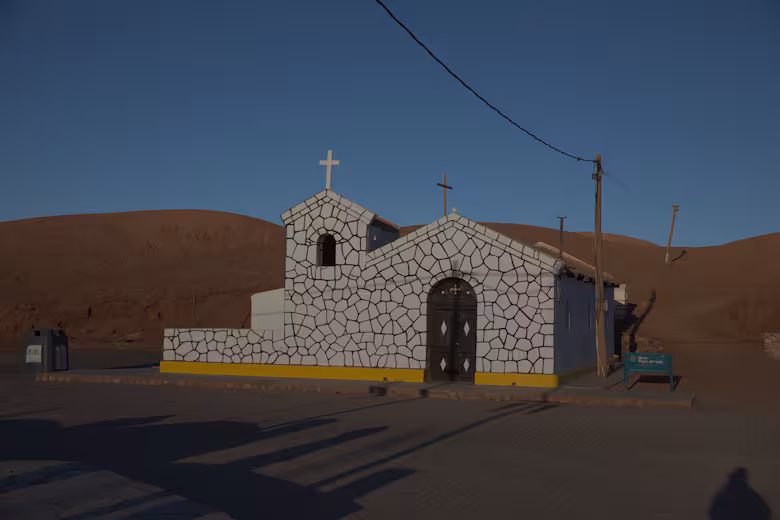 Una vicuña cruza corriendo el pueblo habitado hoy sólo por pequeñas aves que buscan comida entre los escombros. La iglesia fue reconvertida en un improvisado refugio (llamado “Refugio del Peregrino”), donde sus eventuales visitantes dejan mensajes, estampitas y dibujan santos en las paredes. La imagen de la Virgen de Fátima custodia el lugar, una pintura firmada por “Azufredo”, en 2013. En un cuaderno Éxito de tapa dura amarilla, hay cientos de mensajes desde el 22 de noviembre de 2021. El primero dice: “Centro de Azufreros, presente. Danos tu bendición”. Hay firmas de todo el mundo: Italia, Austria, Estados Unidos. Abajo, otro libro de tapa dura roja contiene mensajes desde 2011, que arranca con una frase: “Juntos en un mismo camino”.