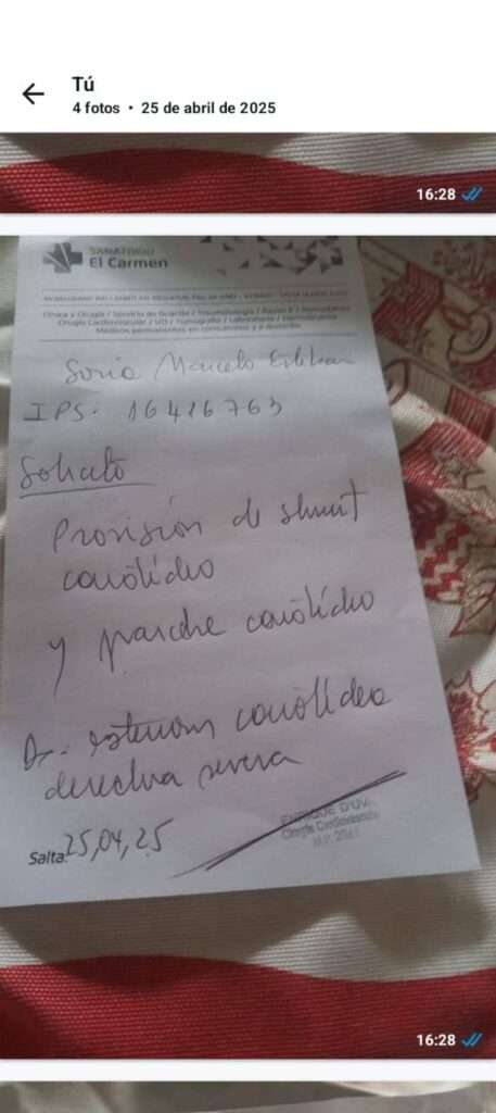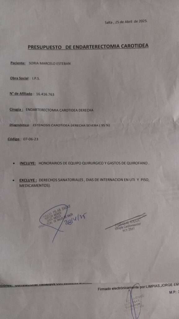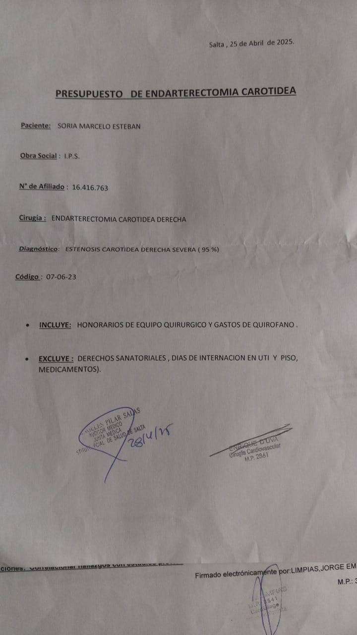 Actualmente, los médicos indicaron la necesidad de realizarle una endarterectomía carotídea derecha, una intervención que no está cubierta en su totalidad por la obra social. La familia debe costear 1.300.000 pesos en materiales quirúrgicos y 600.000 pesos de honorarios médicos, sumando un total de 1.900.000 pesos, una cifra imposible de alcanzar para ellos sin ayuda.