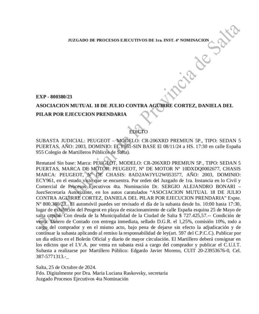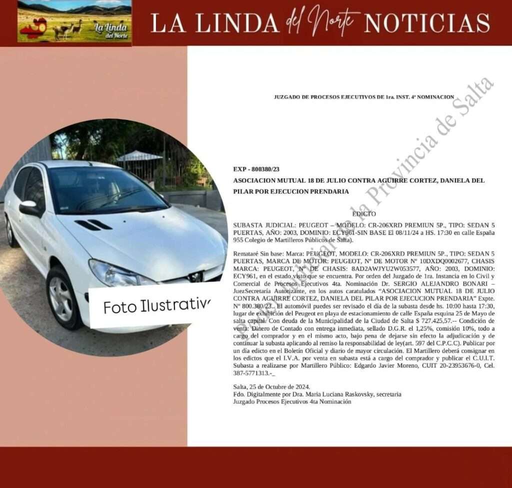 Este viernes 8 de noviembre de 2024, se llevará a cabo una subasta judicial en el Colegio de Martilleros Públicos de Salta, ubicado en calle España 955. El evento comenzará a las 17:30 horas y tendrá como protagonista un Peugeot CR-206XRD Premium 5P, año 2003, dominio ECY961, sin precio base.