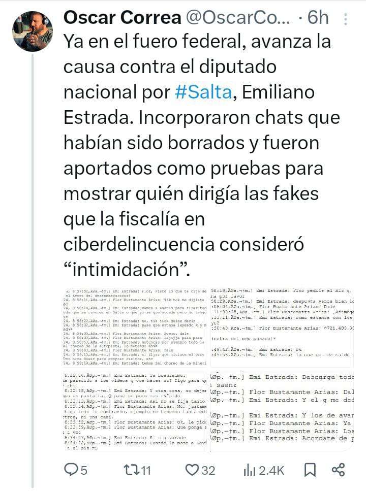 El periodista Oscar Correa fue uno de los primeros en difundir esta información a través de su cuenta de X, donde escribió: “Ya en el fuero federal, avanza la causa contra el diputado nacional por #Salta, Emiliano Estrada. Incorporaron chats que habían sido borrados y fueron aportados como pruebas para mostrar quién dirigía las fakes que la fiscalía en ciberdelincuencia consideró ‘intimidación’”.
