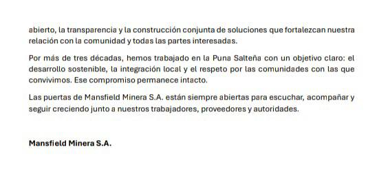 Mansfield Minera hizo un llamado a la tranquilidad de las familias involucradas y reafirmó su disposición a sostener un diálogo abierto con trabajadores, proveedores y autoridades para construir soluciones de manera conjunta. Además, la empresa recordó que lleva más de tres décadas trabajando en la Puna salteña con el objetivo de fomentar el desarrollo sostenible, la integración local y el respeto por las comunidades.