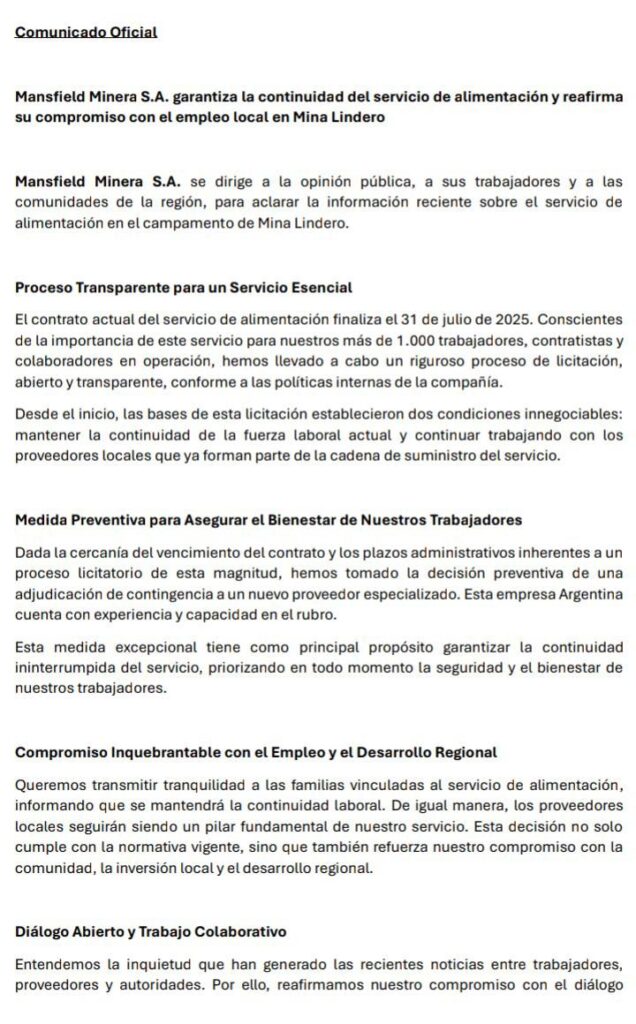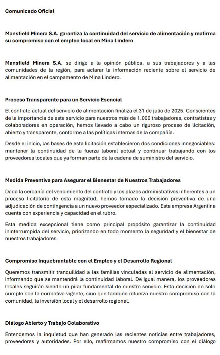 Ante el malestar generado por la contratación de una nueva empresa de catering para el campamento de Mina Lindero, la firma Mansfield Minera S.A. emitió un comunicado oficial en el que garantizó la continuidad del servicio de alimentación, así como el mantenimiento de los puestos de trabajo y la participación de proveedores locales.