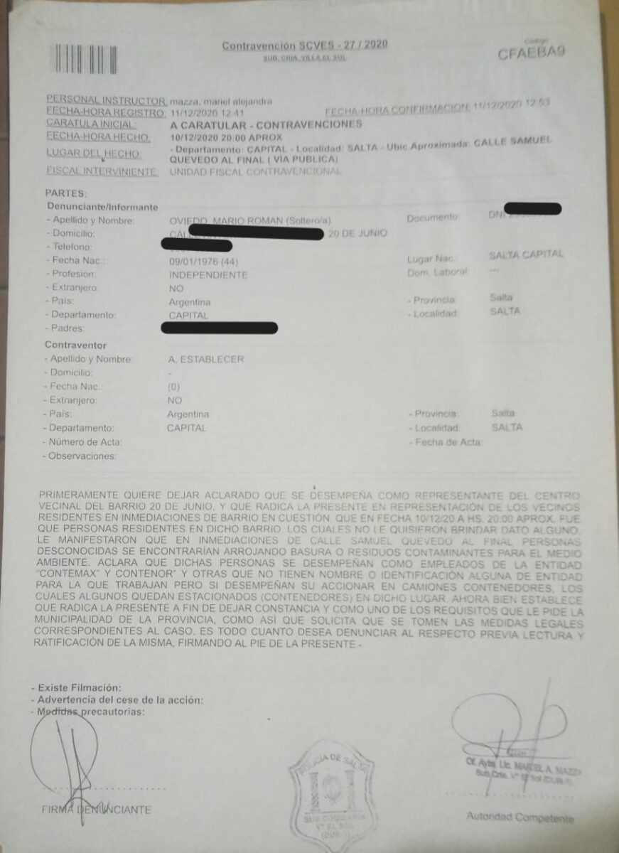 Sin embargo, trascendieron denuncias previas que contradicen sus declaraciones. Ya en octubre de 2017, cuando Gustavo Sáenz era intendente, el presidente del Centro Vecinal del barrio 20 de Junio denunció ante la subcomisaría de Villa El Sol que «la empresa Contemax descarga sus contenedores con restos de escombros y basura al margen del río Arenales». En ese mismo escrito se advertía sobre un incendio de gran magnitud ocurrido previamente, atribuido a la acumulación de botellas plásticas y aerosoles, y se alertaba sobre el riesgo para las viviendas cercanas.