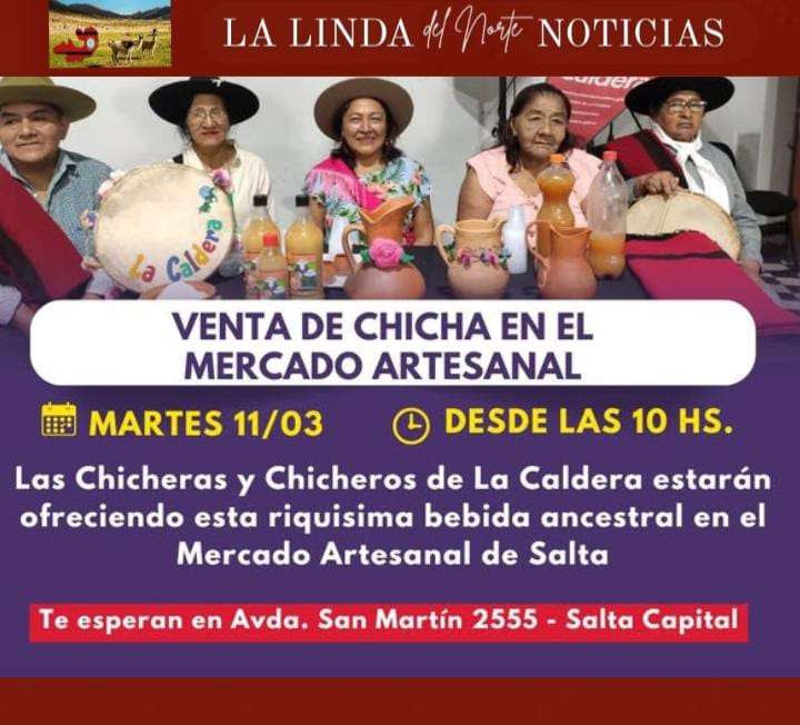 El próximo martes 11 de marzo, las chicheras y chicheros caldereños ofrecerán su tradicional chicha en el Mercado Artesanal de Salta, ubicado en avenida San Martín 2555. Esta iniciativa surge como respuesta a la gestión realizada por el Municipio, luego de la postergación del Festival de la Chicha.